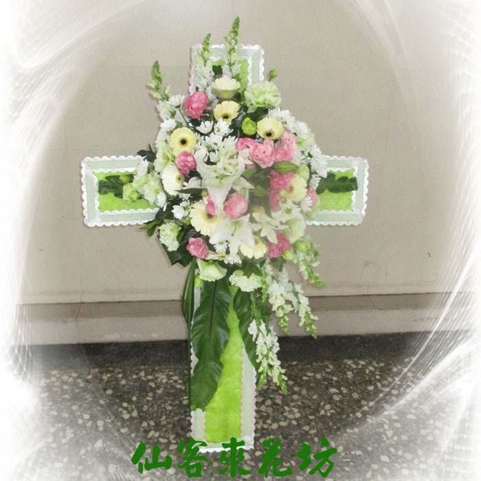 【喪禮十字架】十字架、喪事十字架、弔唁十字架、致喪十字架、弔唁花禮十字架一個,素雅莊重,喪禮十字架適合送到追思禮拜的靈堂表達永遠的哀思,花材配色依往生者的年齡而定。