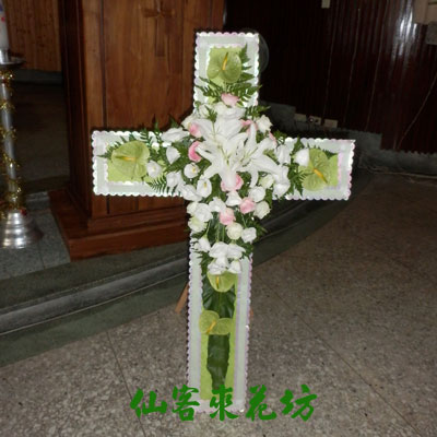 基督教追思喪禮弔唁的十字架花圈,在追思禮拜上為姐妹弟兄安息.榮歸天國。